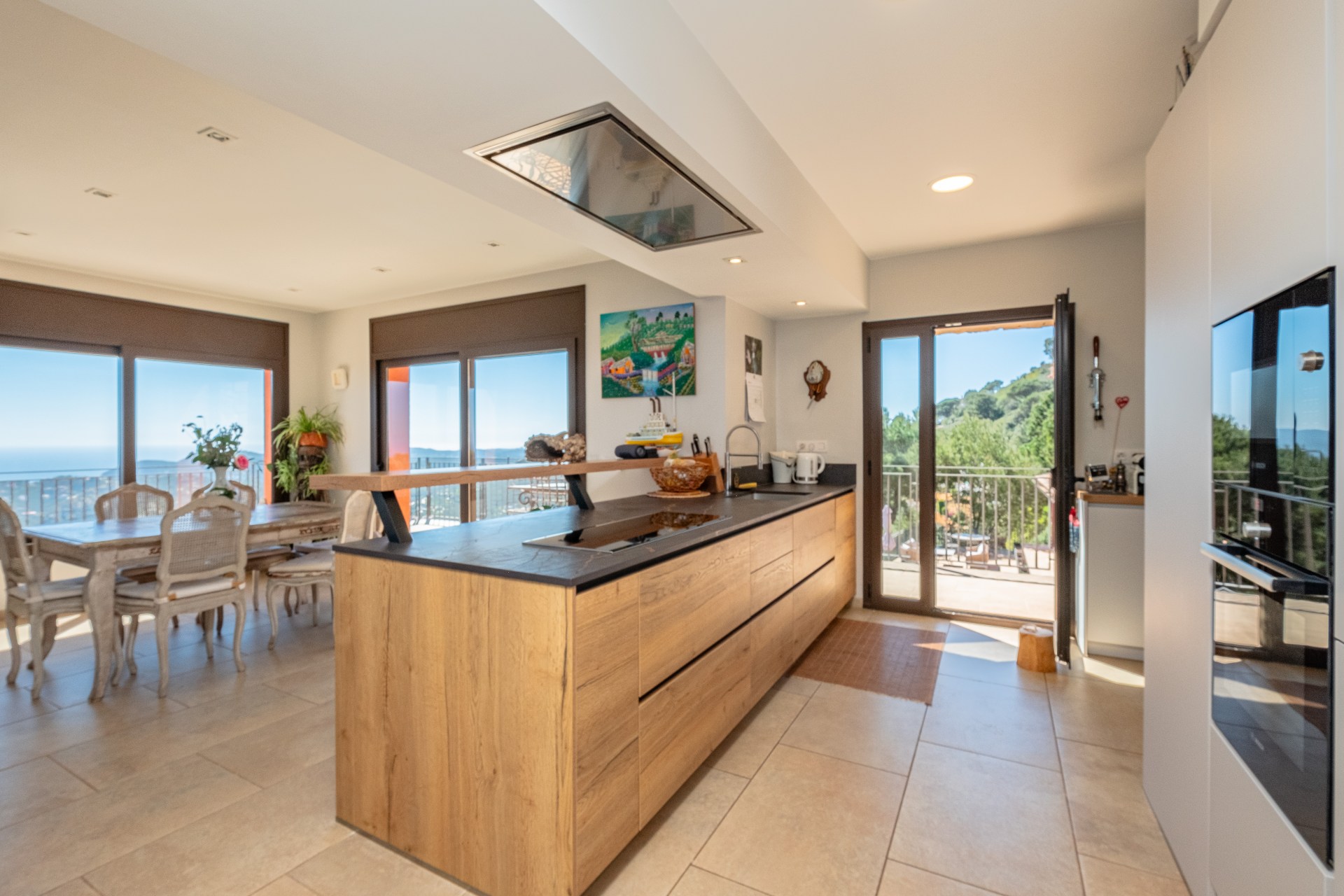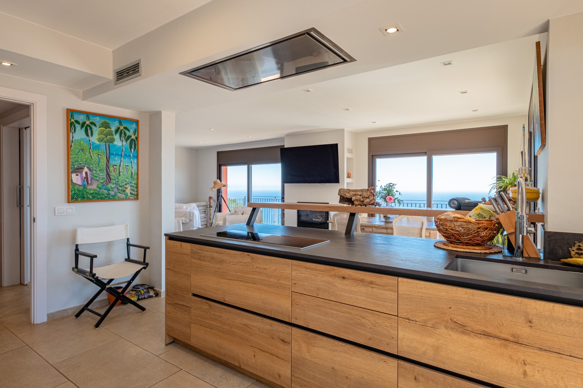 Espacioso salón-comedor con cocina integrada, todo abierto hacia el mar a través de ventanales panorámicos.