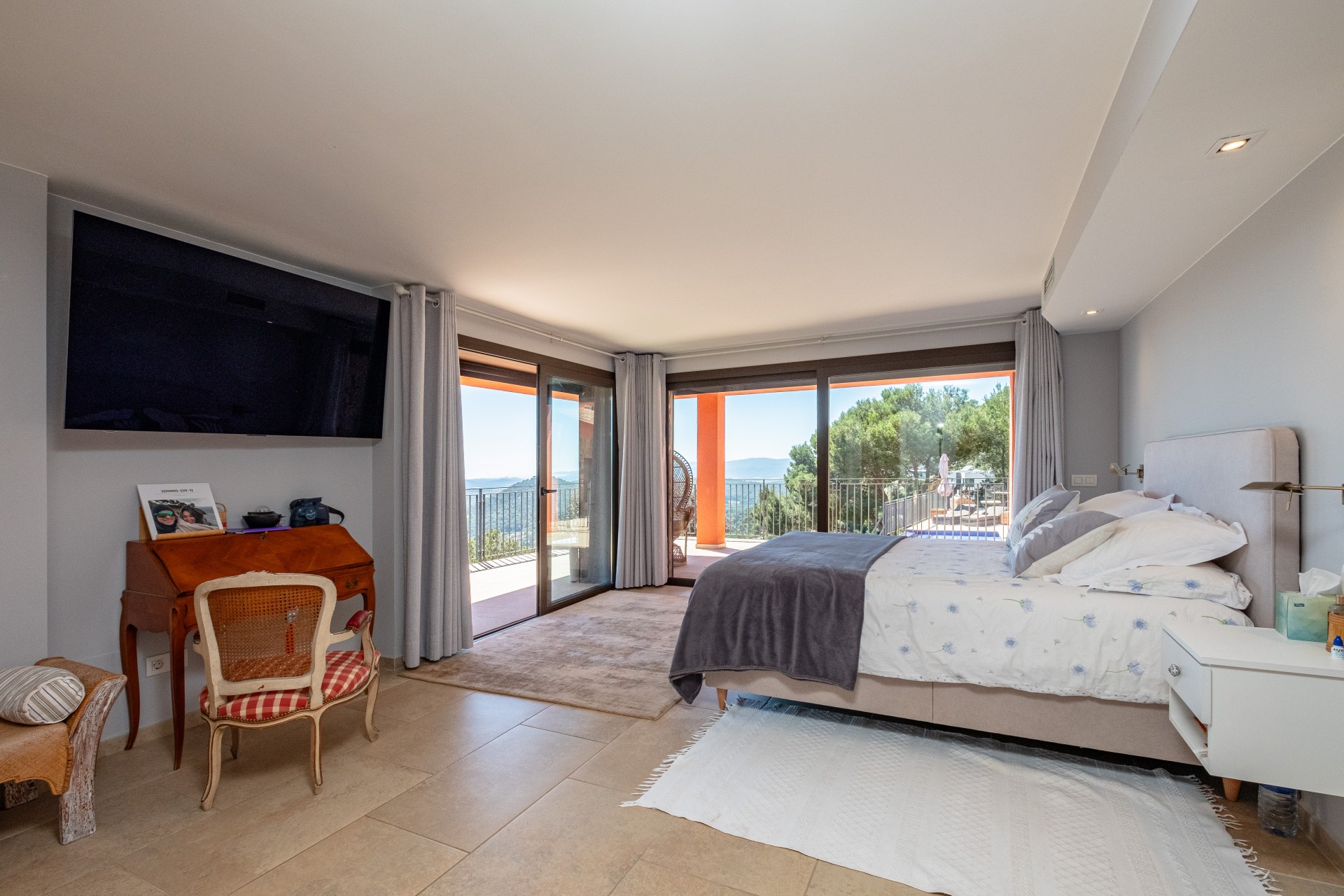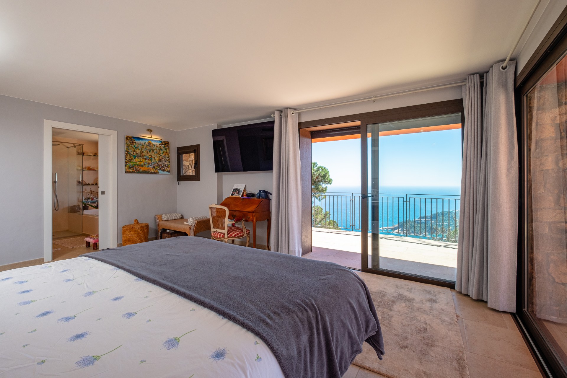 Suite principal con baño privado, vestidor, gimnasio y acceso directo a la terraza.
