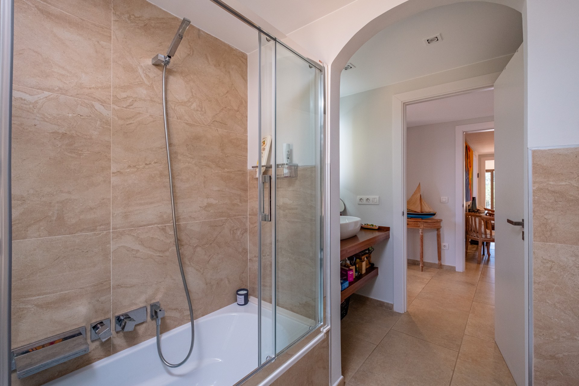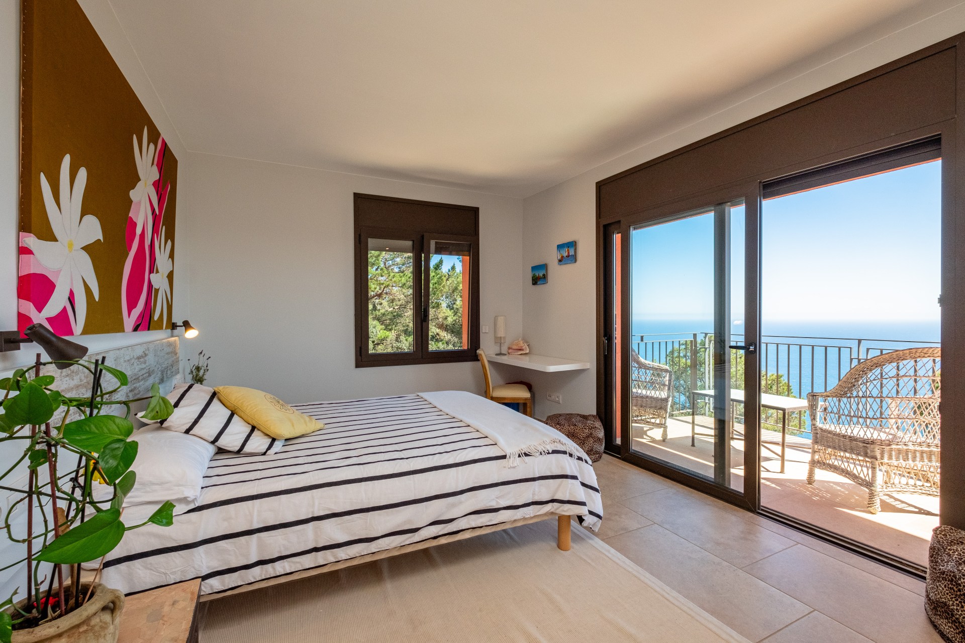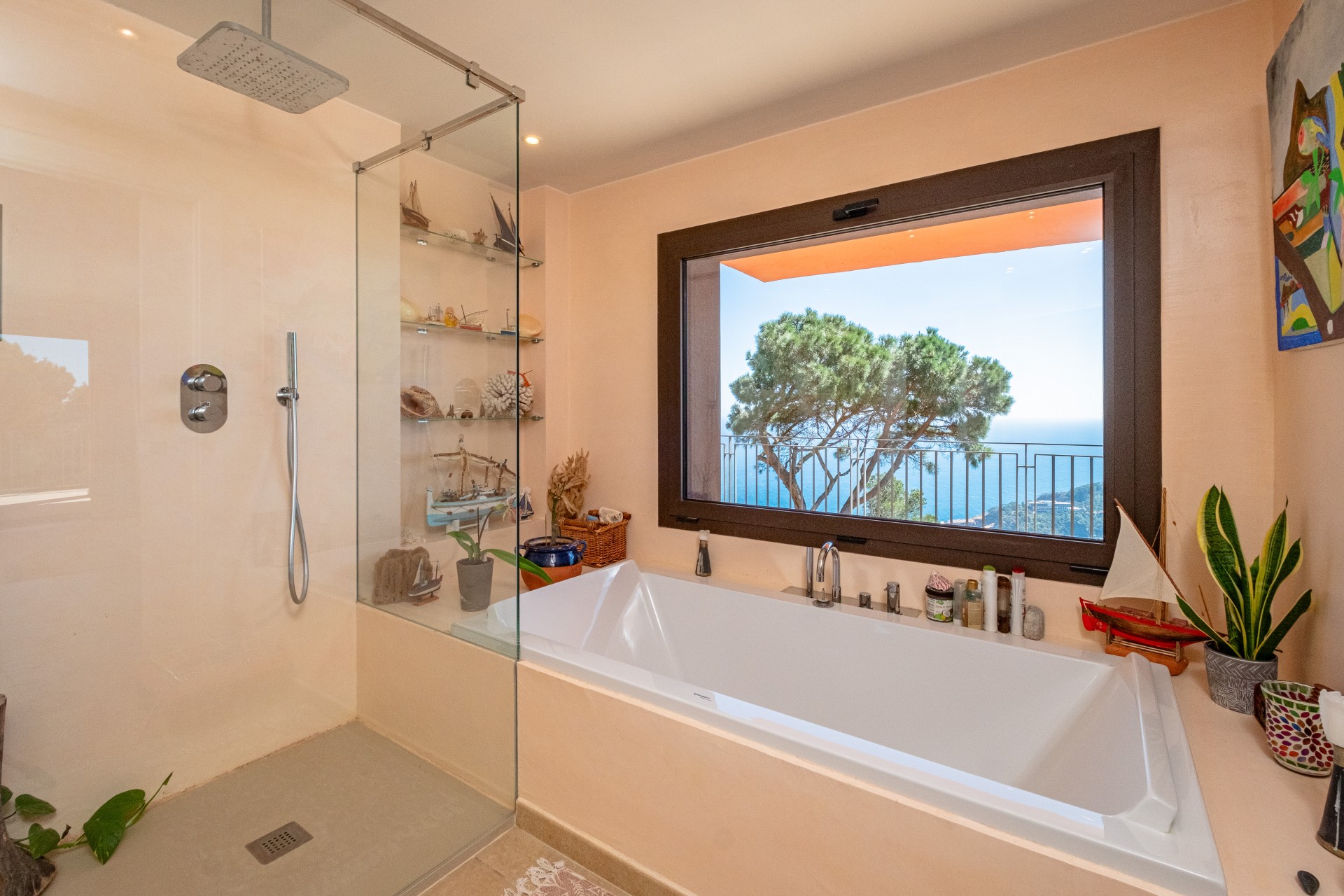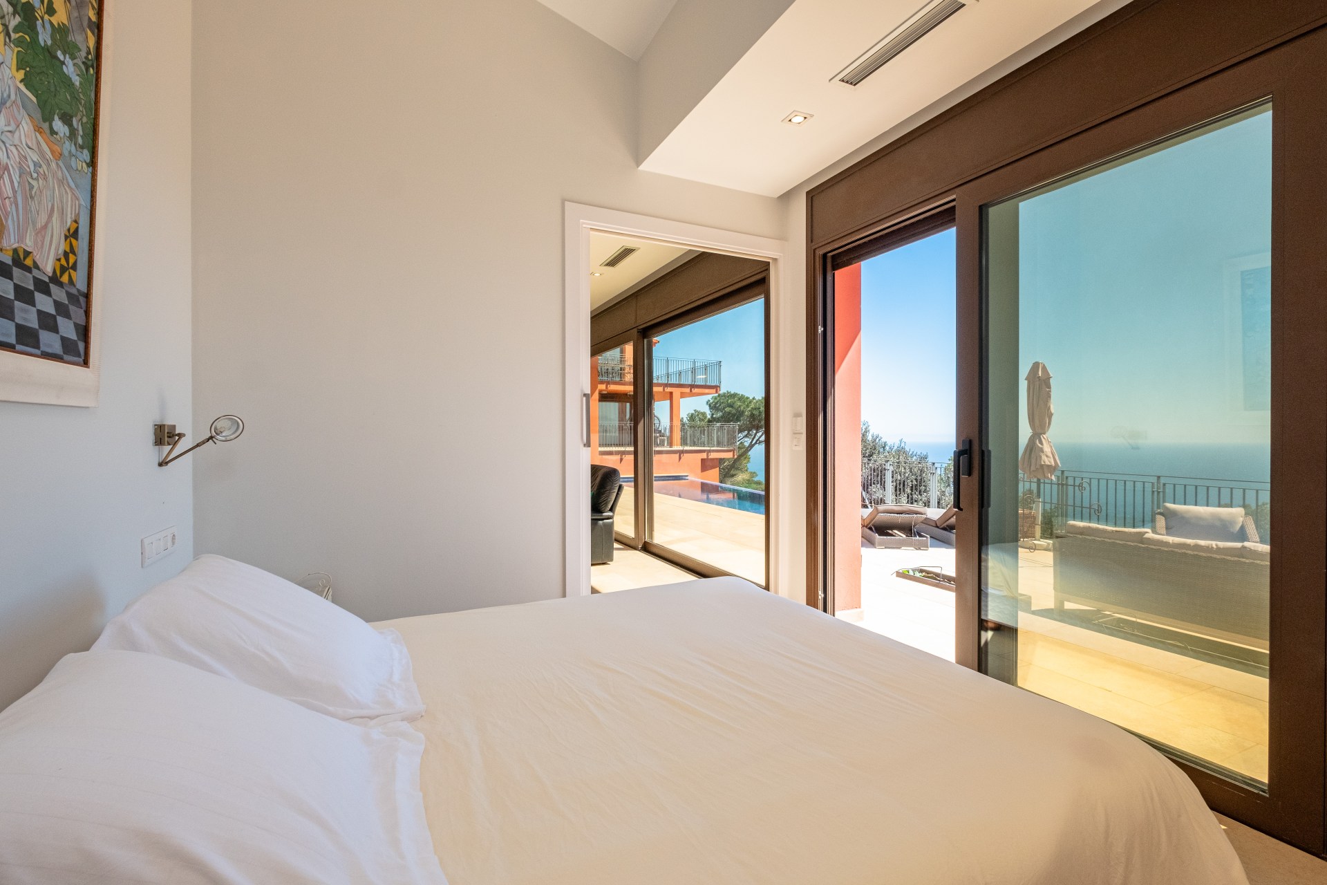 Un cuarto de baño completo, trastero y acceso a la zona exterior con piscina infinita de agua salina, suspendida sobre el Mediterráneo.