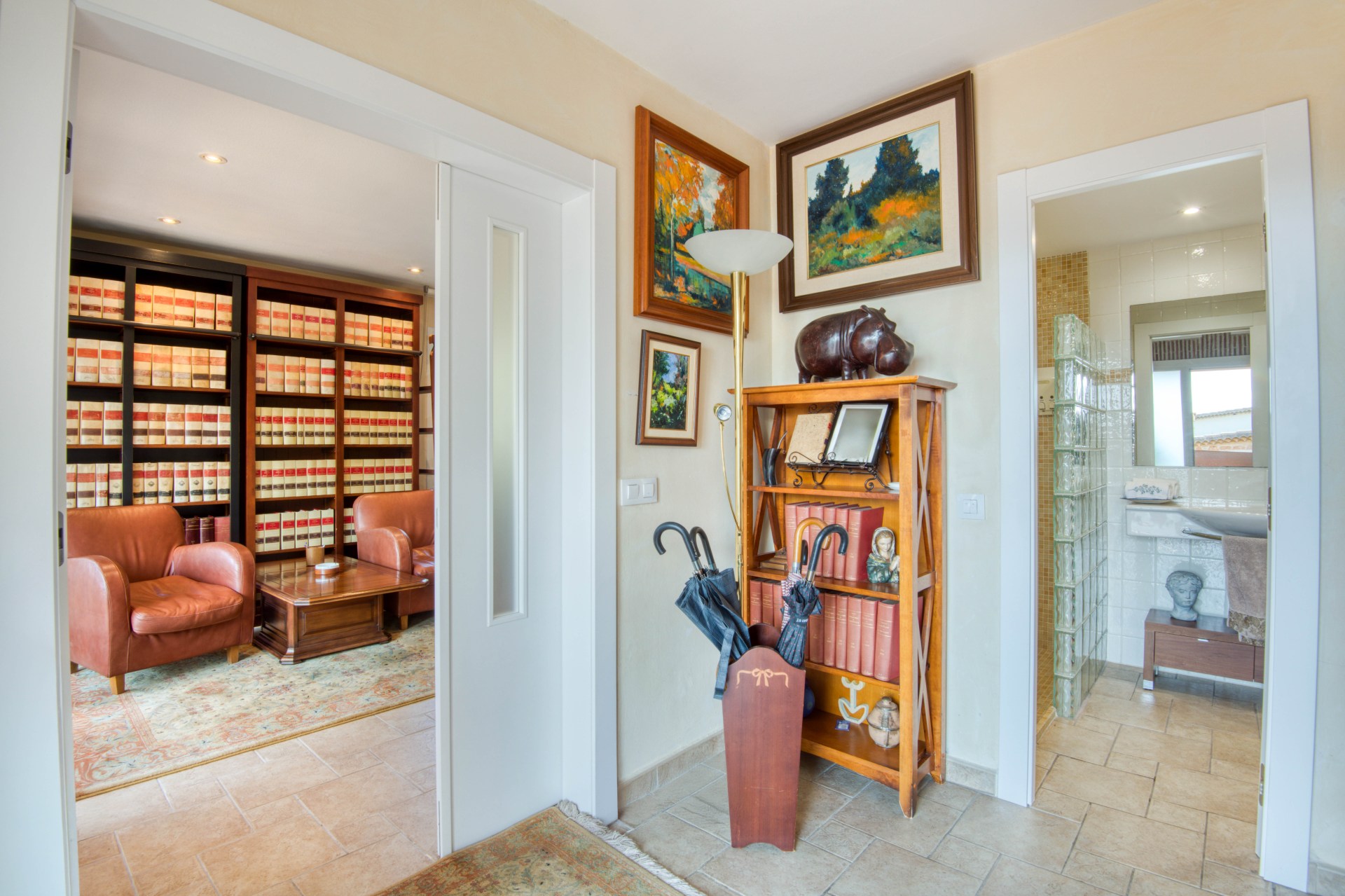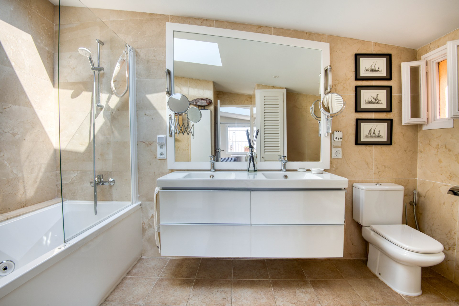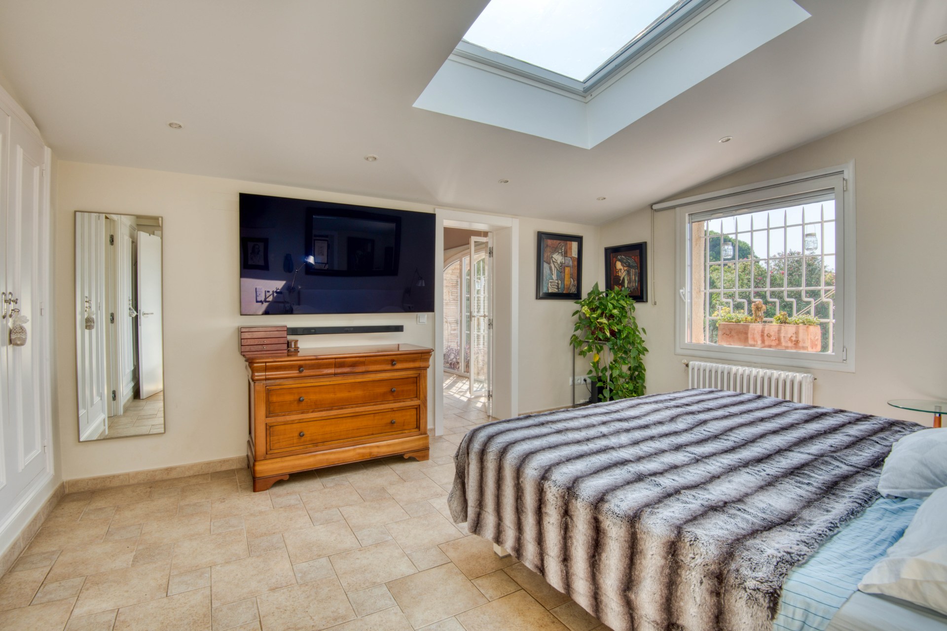 En la planta superior, dos dormitorios dobles con armarios empotrados y un baño completo acompañan a la suite principal, que destaca por su baño privado, vestidor, zona de despacho y acceso directo a una terraza con vistas panorámicas sobre Platja d’Aro.
